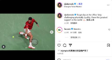 昨晚的上海大师赛真是精彩绝伦!德约科维奇鏖战2小时41分钟,最终以2-1击败穆纳尔晋级八强。赛后这位网坛巨星在社交媒体上动情写道:“体能上极具挑战的一天;幸运的是,我拥有世界上最棒的支持,我爱上海。”